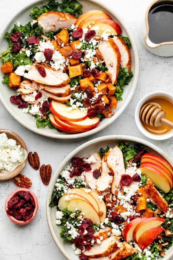 Embrace all of the autumn vibes with this tasty Fall Harvest Salad. Made with sweet potato, chicken breast, cranberries, and pecans, it’s a delicious meal sure to leave you full and satisfied for hours.